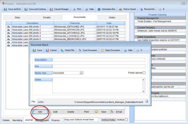 attach documents. Use the ‘Property’ and ‘Tenant’ drop down boxes to attach the