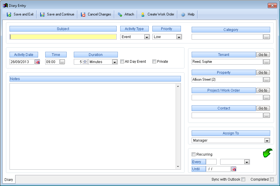 the ‘Diary’ tab click on ‘Add’ to open the ‘Diary Entry’ window, from here you