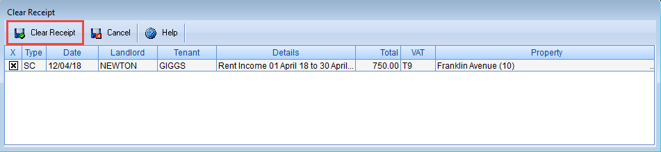 Once the receipt has been completed, the 'Clear Receipt' popup will appear for you to clear the receipt to the Landlord