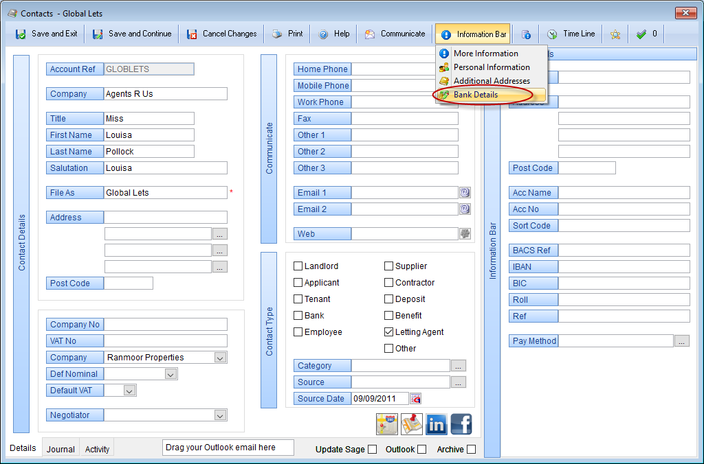View Contact Bank: Allows the user to view a contacts bank details from the information bar within