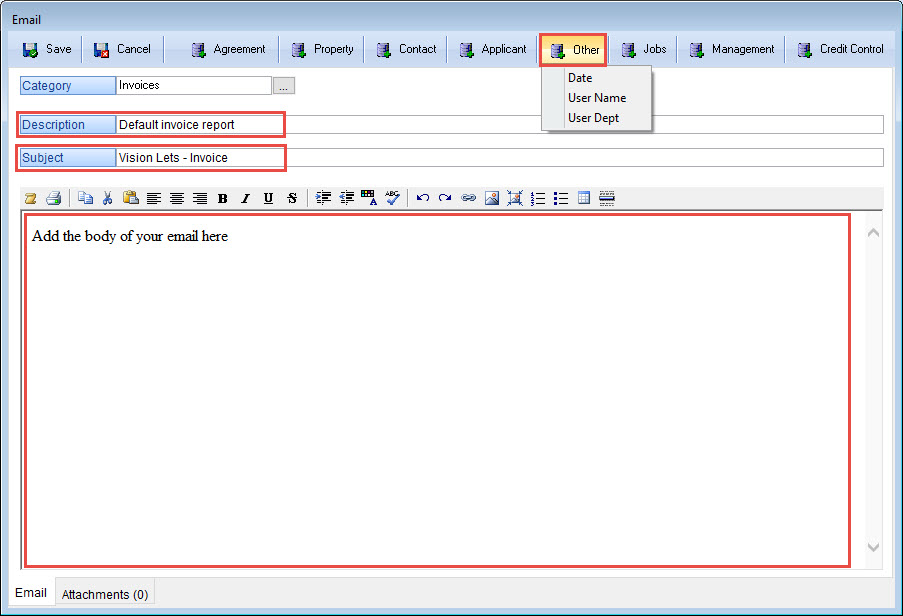 Add a description of what the template is for, the subject of your email and the body of your email. Merge fields are available from the top bar to bring through information such as todays date