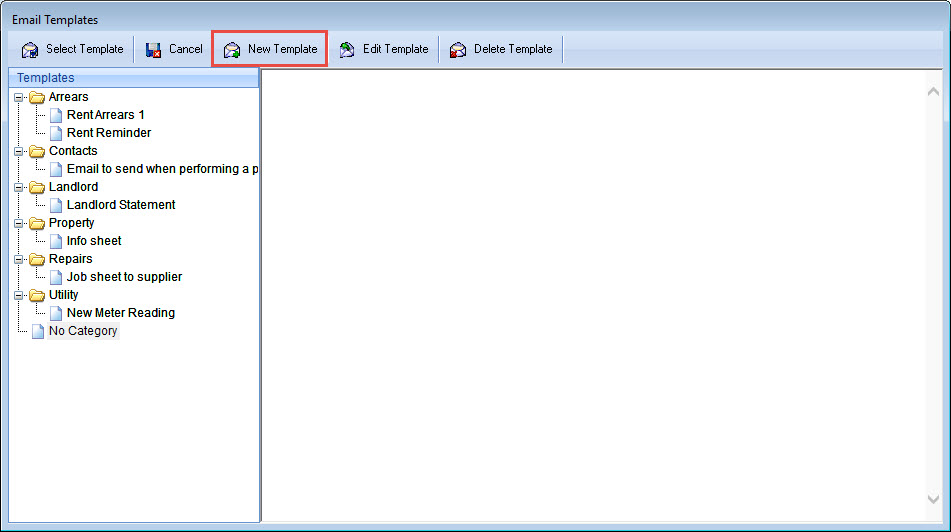 to the right of the field will open the Email Templates viewer. In here you can see a list of the available templates as well as edit or create new ones. To create a new one, click New Template