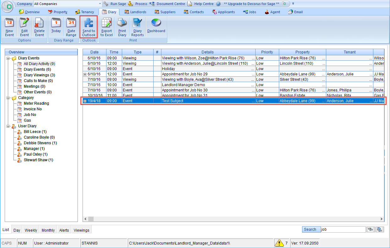 Go to the 'Diary' module and you will find that the new event that you add is not in the list. To send your diary event through to the Outlook diary, click 'Send to Outlook' -