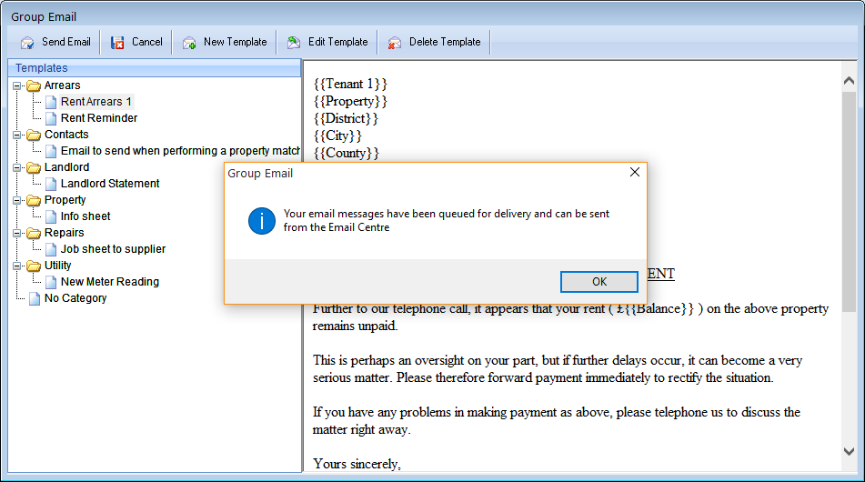 group, Email or Tenant group Email. Select the template and click ‘Send Email’.