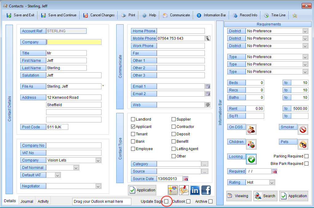 not yet tenants, you need to make sure the contact record is updated into Sage