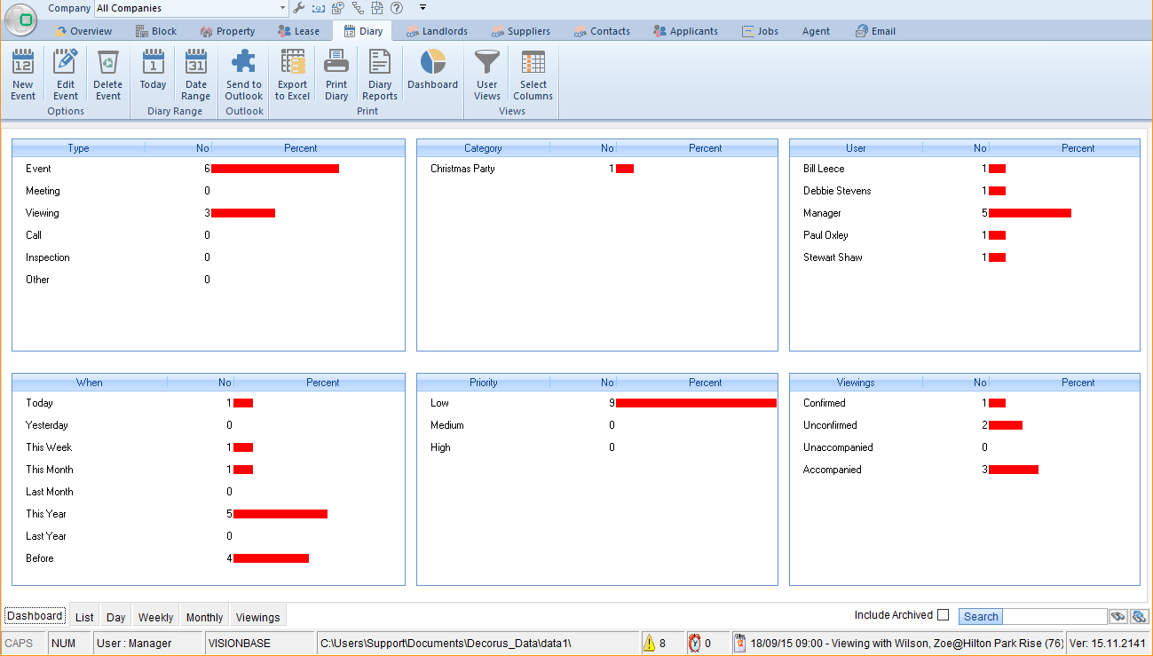 ‘Dashboard’ view gives you an overview of the whole diary section. Double