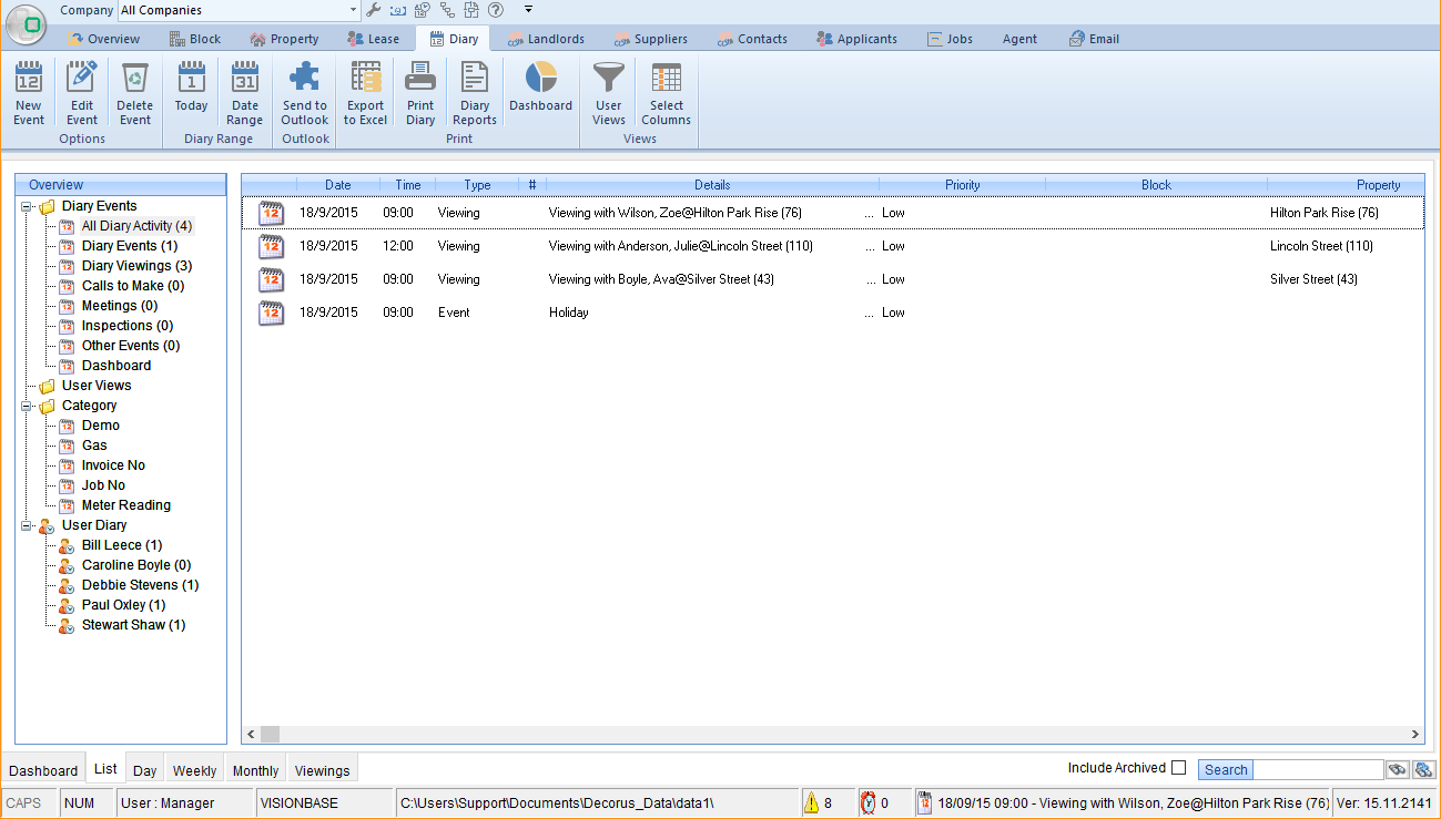 The ‘List’ view will consist of all ‘diary’ type events