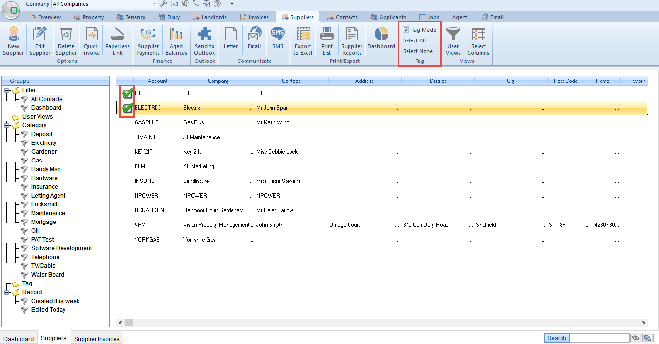 select multiple entries at once (by ticking each one) for mass communication.