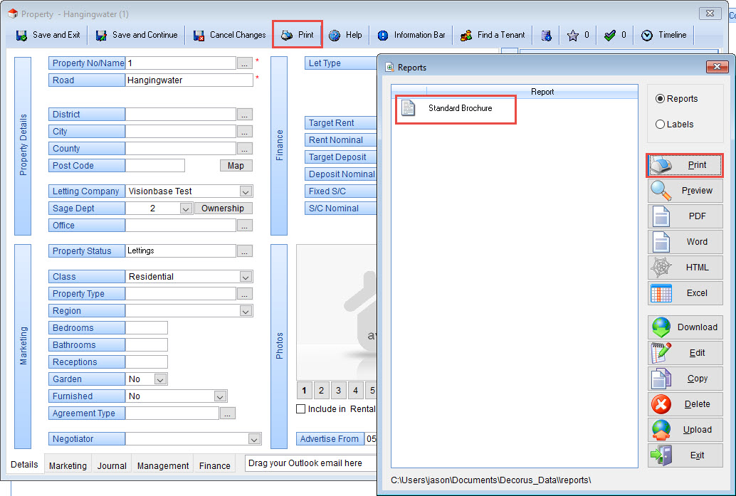 Users can also print different documents from within records, such as Property, Tenancy and Contact Records.